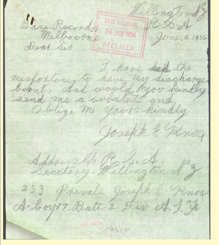 One of the other documents held by the AWM is a letter to Base Records from Joe himself. The handwriting is shaky, the tone apologetic. The letter is short and self-effacing; it’s as if he’s wishing himself out of existence in the very act of asking that his record be restored. He’s asking for a copy of his discharge papers, the original being lost: ‘I have the misfortune to have my discharge burnt’. That passive phrasing sounds the retreat.